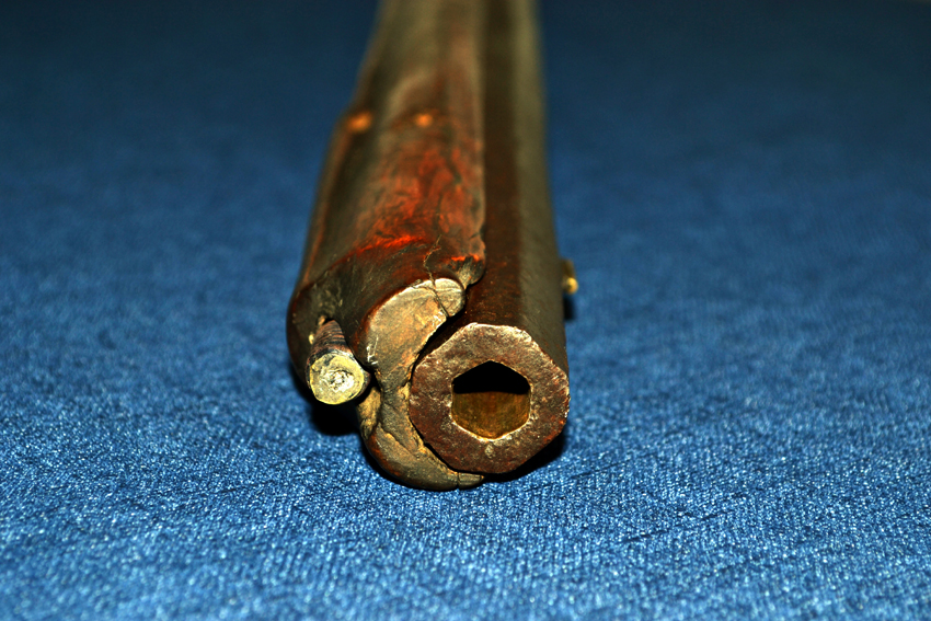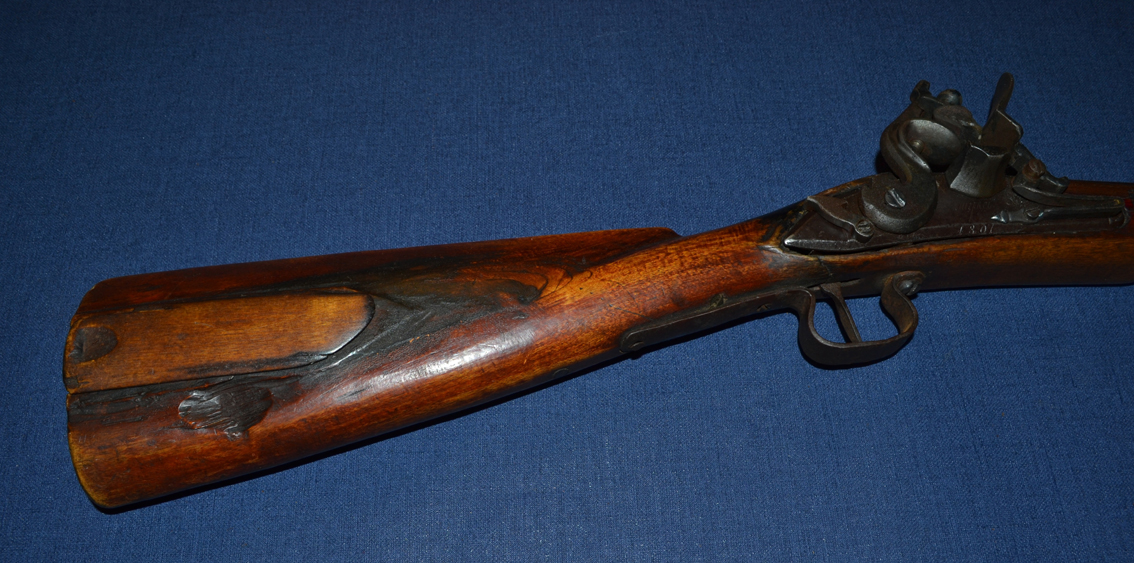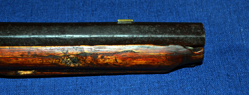 The gun appears to have had a long working life; indicating its high essential quality. The barrel and lock are in good condition (considering age) and the barrel has a well defined rifled bore. The lock-face and barrel have not been cleaned externally, and the barrel only briefly brushed internally.